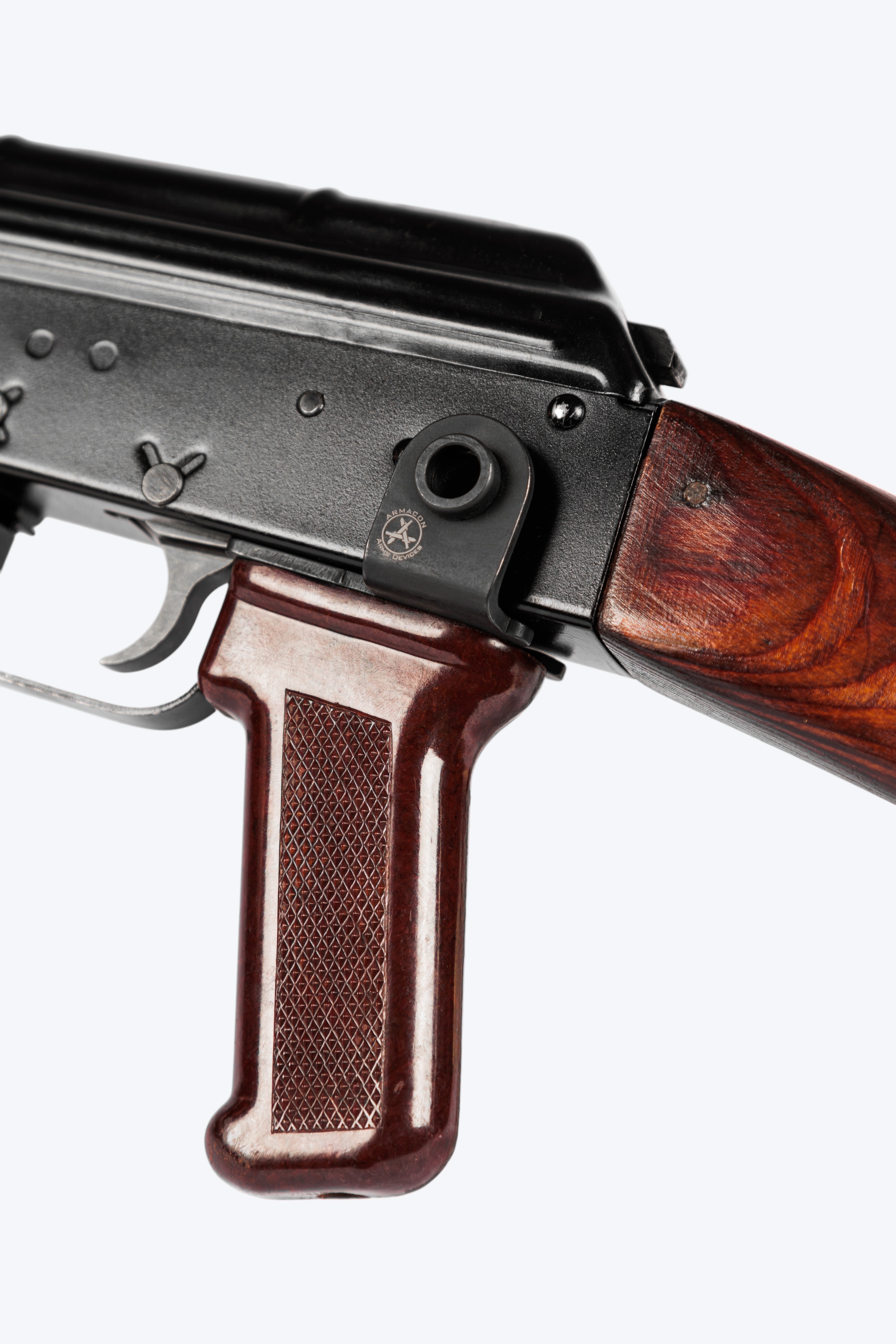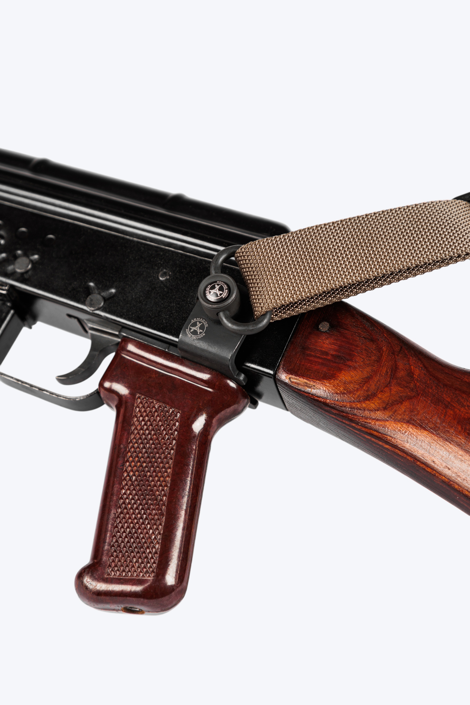 Антабка производства Armacon Arms Devices, выводящая проушину под быстросъемную QD антабку на левую сторону, обеспечивает оптимальное крепление для всех типов ремней с быстросъемной антабкой, в особенности для одноточечных. Крепится под рукоятку управления огнём. Удачное решение для автоматов Калашникова, их модернизаций и гражданских карабинов на их базе с не складным прикладом и без боковой планки.
